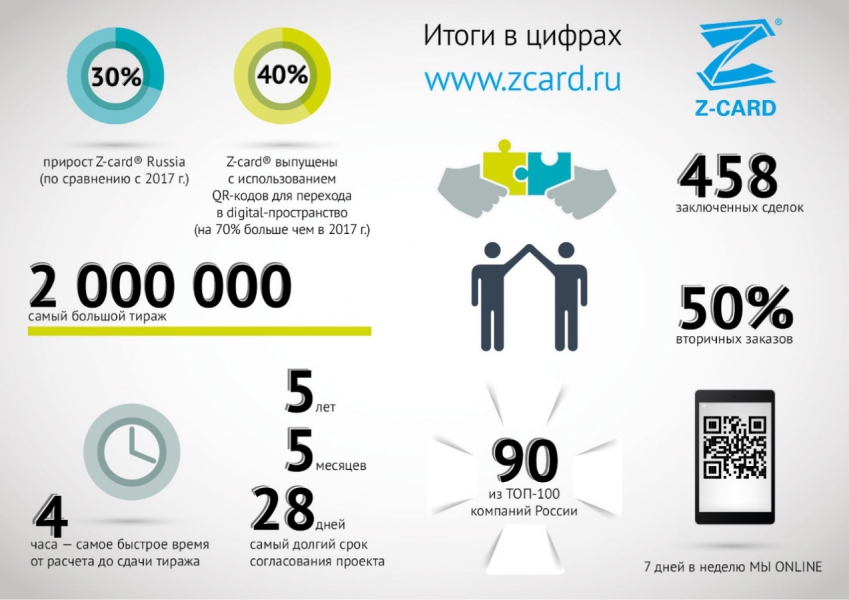 Z-card® Russia удалось реализовать свыше 450 тиражей. Освоен и выведен на рынок формат Infinity — буклет-трансформер, действующий по принципу «вечного двигателя».