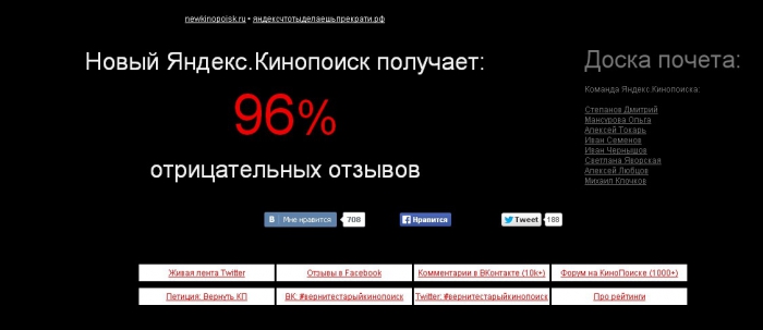 Один из пользователей Рунета даже создал агрегатор отзывов на обновленный киноресурс, согласно которому новая версия «КиноПоиска» собрала уже 96% отрицательных отзывов.