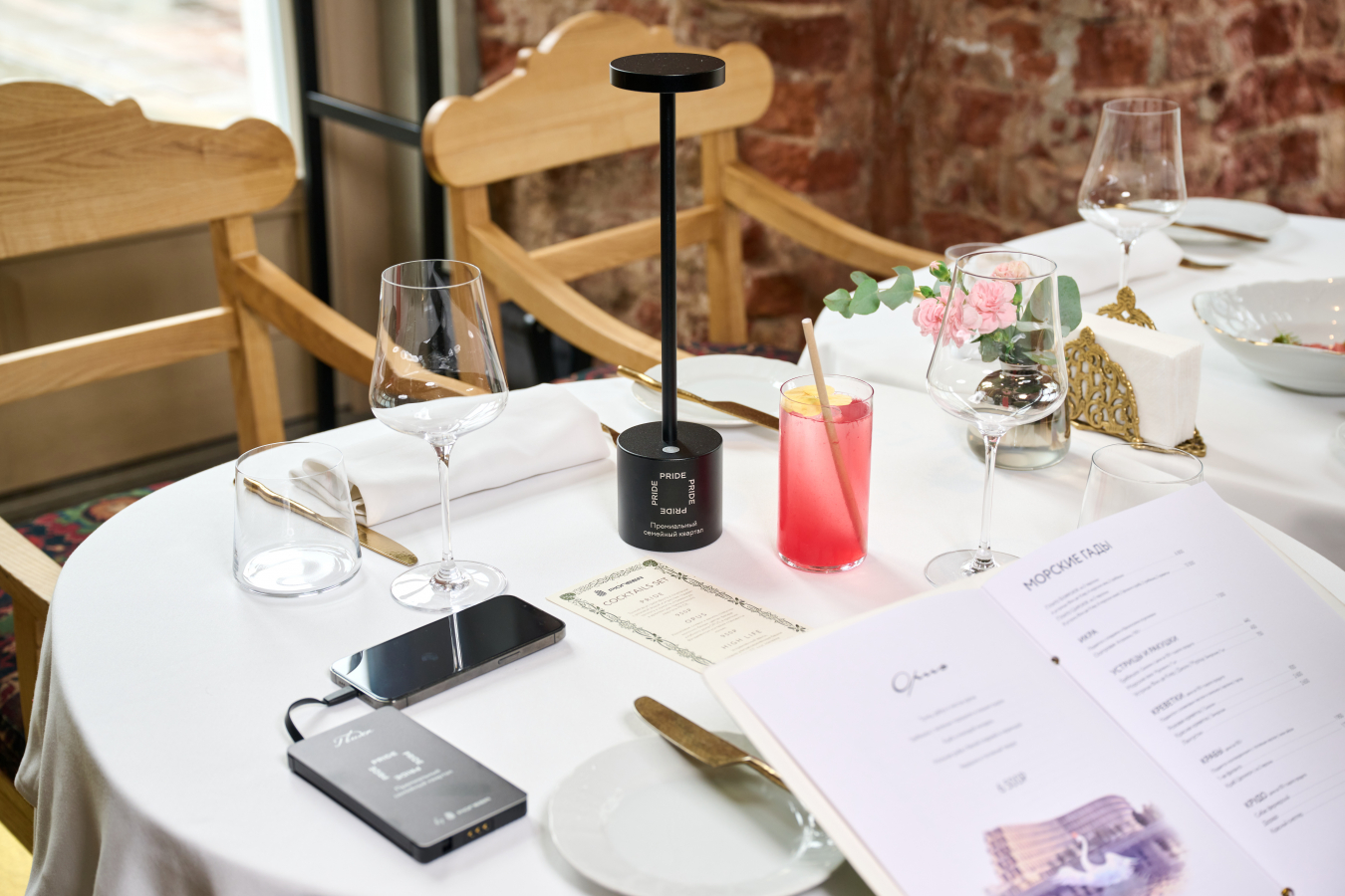 Для ресторана продумали концепцию фотозоны с живыми растениями. По архитектурной форме она отсылала к проекту High Life. И еще забрендировали повербанки, — деталь, которой всегда были рады гости заведения.