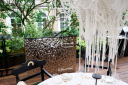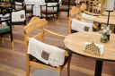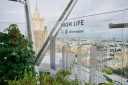 В этом ресторане одна из самых крутых открытых террас с видом на город. Площадка идеально подходила для коллаборации с ЖК High Life от PIONEER, чьей фишкой были панорамные виды на Москву. Чтобы интеграция лаконично вписалась в интерьер, сделали брендированную оклейку на стекле с той стороны террасы, где виднелся строящийся High Life, — так появился своеобразный прообраз будущего ЖК.