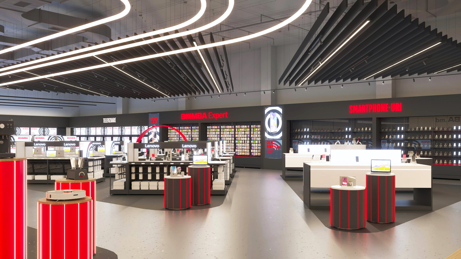 Центром торгового пространства стала зона самообслуживания и клиентского сервиса, ориентированная на удобство покупателей. Ребрендинг подчеркивает технологичность и высокий уровень обслуживания, закрепляя Bomba как лидера рынка в своем сегменте.