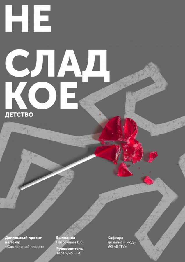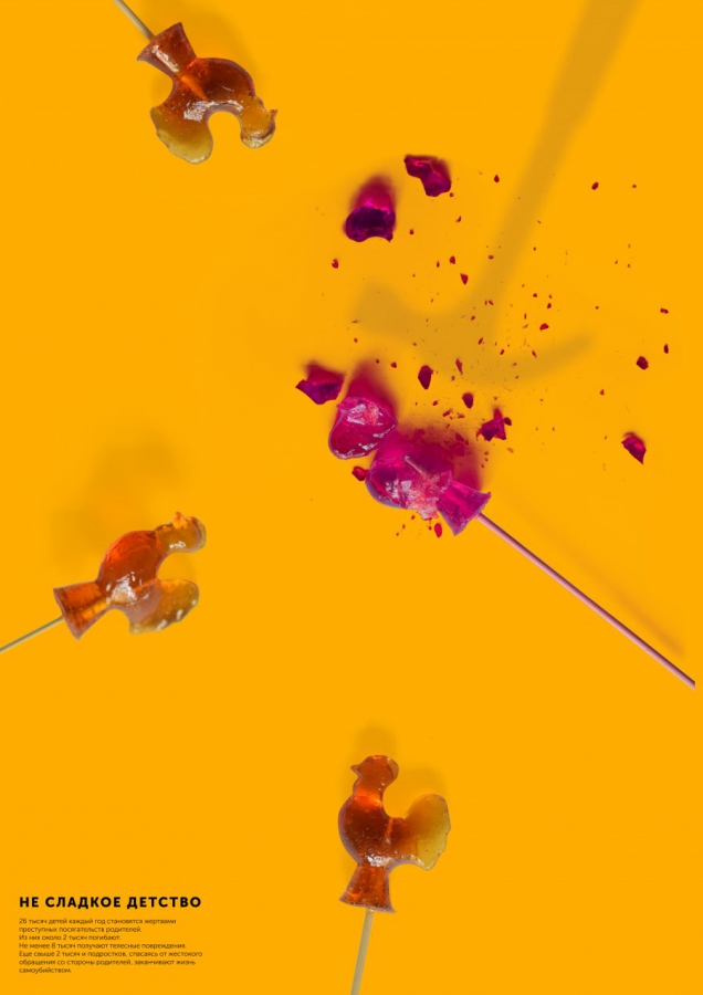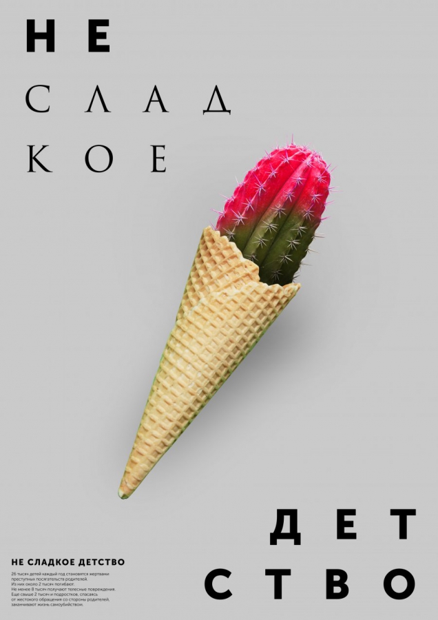 Описание: «Основной целью проекта является создание серии социальных плакатов на тему «Детский травматизм». Задача постеров — предотвратить детское психическое и физическое насилие. Детский травматизм — выделяется в отдельную категорию. Он вызывает особую тревогу. Дети получают тяжелые травмы, увечья и даже гибнут, будучи дома, играя во дворе, на стадионах, в школах, в дорожно-транспотрных происшествиях. Травматизм и насилие являются главными причинами гибели детей во всем мире».