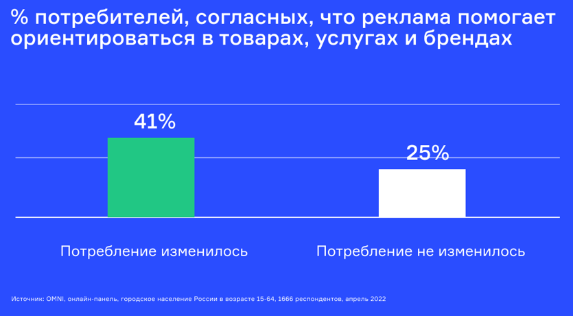 Среди тех, чьё потребление изменилось, 41% опрошенных отметил, что реклама помогает ориентироваться в ассортименте товаров и услуг. В группе респондентов с неизменным потреблением так ответили 25%.