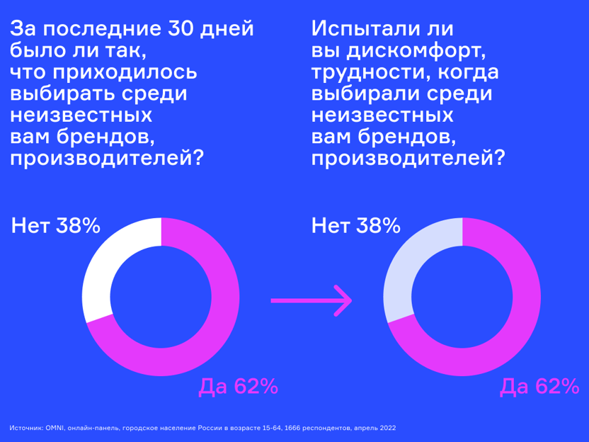 Агентство OMI провело исследование по заказу Национального рекламного альянса (НРА) и выяснило, на российском FMCG-рынке заметны изменения в потреблении. Так, 69% опрошенных россиян заявили, что им приходилось искать замены ушедшим иностранным брендам в апреле 2022 года. 62% выбирали товары среди неизвестных производителей, и такое же количество респондентов сообщили, что испытывали дискомфорт при замене привычных товаров. Результаты исследования имеются в распоряжении Sostav.