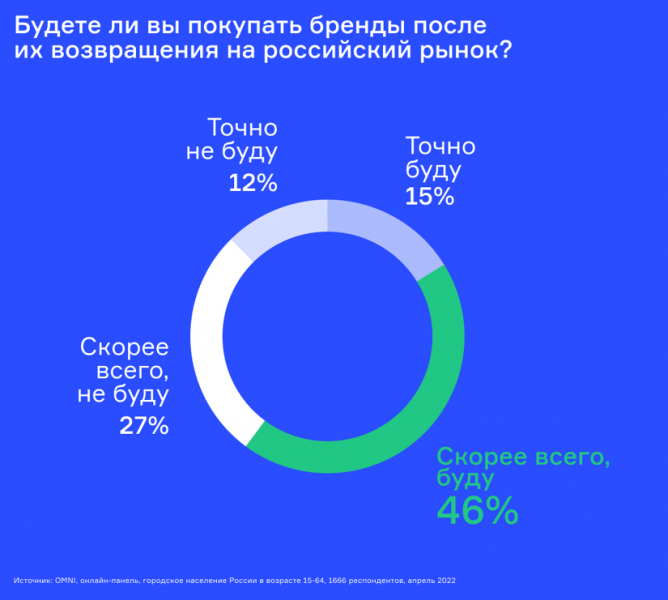 Большинство россиян сомневаются насчёт возвращения к покупке товаров ушедших брендов в случае их возвращения: скорее будут покупать 46%, точно будут — 15%, скорее всего, не будут 27%, а ещё 12% уверены, что откажутся от продукции компаний.