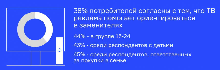 Кроме того, 38% потребителей согласились с утверждением, что реклама на ТВ позволяет ориентироваться в заменителях ушедших брендов. Так ответили 44% молодых людей в группе 15−24 лет, 43% респондентов с детьми и 45% тех, кто занимается покупками в своей семье.
