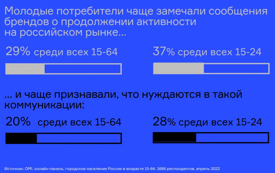 Исследователи отметили, что среди молодёжи было больше тех, кто замечал сообщения об уходе брендов или их стремлении остаться на российском рынке, чем среди всех респондентов. Среди всех опрошенных в возрасте 15−64 лет об этом заявили 29%, а в возрастной группе 15−24 лет так ответили 37%.
