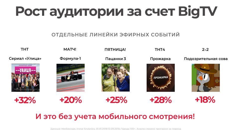 Мегаселлер продолжает внедрять систему продажи телерекламы по технологии programmatic и расширять пул каналов, рекламные возможности которых продаются по системе Big TV. Помимо телеканалов «Газпром-Медиа» НРА будет продавать рекламу по Big TV на «Первом канале» и «России-24» с 2019 года, объявил Васильев.