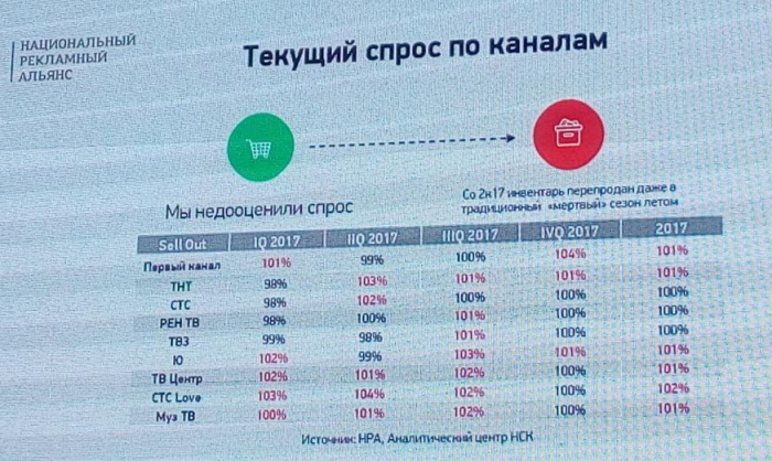 В текущем году телесмотрение падало быстрее, чем ожидалось, и НРА недооценил спрос на телерекламу, сказал Сергей Васильев. Это привело к тому, что инвентарь телеканалов был полностью распродан, даже в "мертвый" летний сезон. Вероятно, спрос будет опережать предложение и в 2018 году.