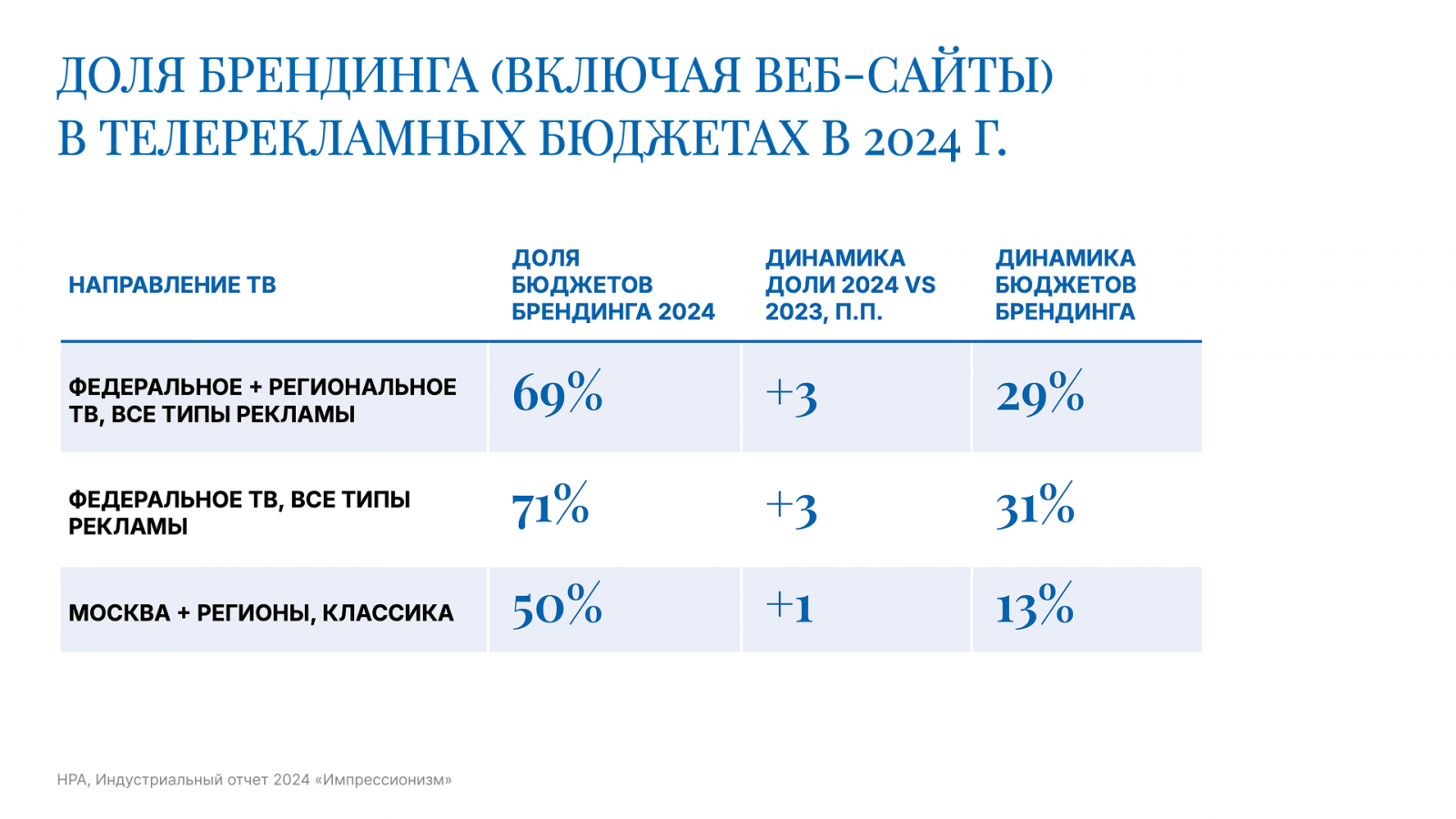 - Изменение структуры телерекламного рынка: увеличение доли брендинговой рекламы и преобладание российских рекламодателей.