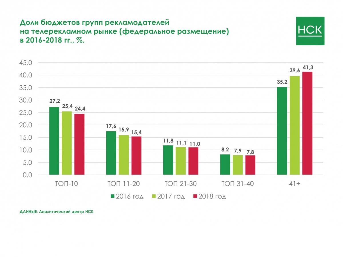 На протяжении последних трех лет снижается доля первых четырех групп, и увеличивается доля группы «41+», то есть средних и мелких рекламодателей. Обычно это свидетельствует об оживлении/росте на рынке. Но в текущей точке времени не все так однозначно. Действительно, можно наблюдать высокую рекламную активность средних и мелких рекламодателей, в более узкой группе «51−250» динамика бюджетов вдвое, а то и втрое опережает рынок. И обратная ситуация в начале списка (группа «Топ-40»), где в том числе собраны FMCG-гиганты, телекомы и крупные фармацевтические компании — традиционные для федерального телевидения рекламодатели. Динамика бюджетов в этой группе значительно ниже рыночной.