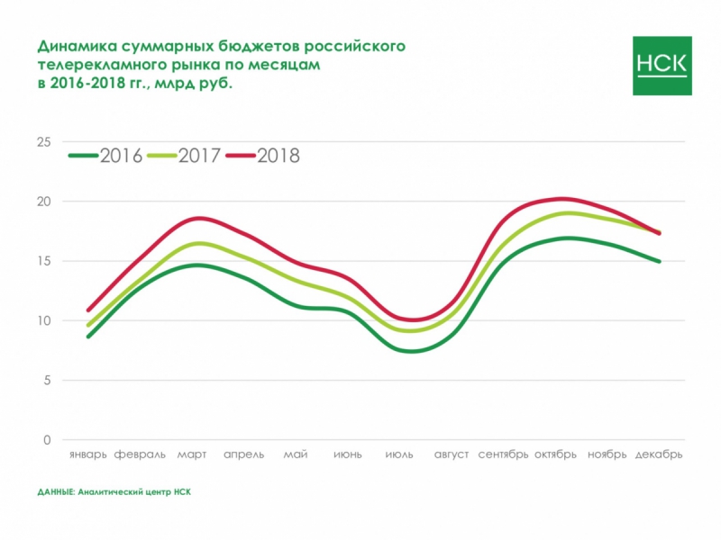 Наиболее высокими темпами (+38% к 2017 году) росли рекламные доходы нишевого телевидения. Сегмент стал абсолютным лидером периода по динамике на рекламном рынке, опередив по этому показателю и онлайн-видео, и интернет-сервисы в целом. Доля нишевого телевидения в общем объеме «рекламного пирога» выросла до 4%. В абсолютном выражении объем рекламных бюджетов составил более 7 млрд рублей.