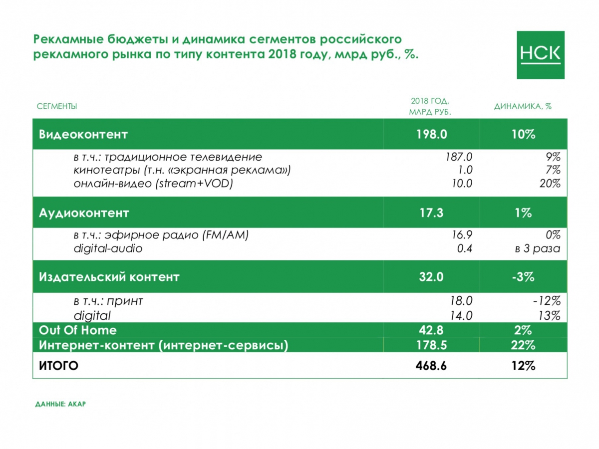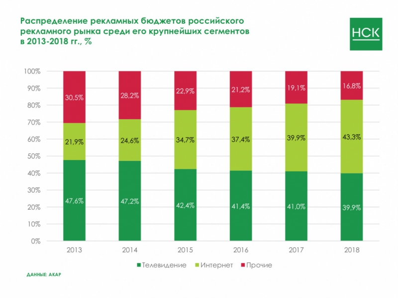- В 2018 году объем рекламных бюджетов в интернете впервые превысил аналогичный показатель на телевидении. На два крупнейших сегмента российского рекламного рынка, примерно равных по объему, приходится более 83% бюджетов.