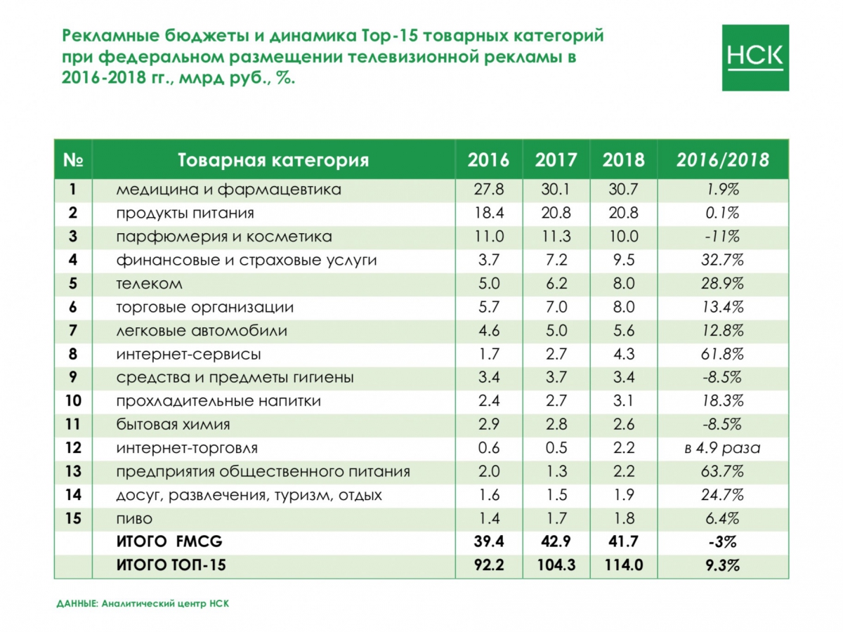Крупнейшие на федеральном телевидении категории «Медицина и фармацевтика», «Продукты питания» и «Парфюмерия и косметика» (их суммарные бюджеты составляют почти половину рынка) показывают динамику ниже рыночной или вовсе отрицательную. Кроме того, отрицательная динамика бюджетов по категориям «Средства и предметы гигиены» и «Бытовая химия». То есть практически все так называемые FMCG категории за рассматриваемый период показали слабые результаты: сокращение бюджетов на 3% относительно аналогичного периода прошлого года и снижение суммарной доли на телерекламном рынке 4 п.п.).