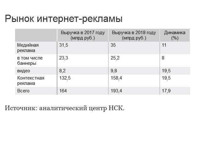 По данным НСК, в 2018 году рост рекламного рынка немного замедлится, он увеличится на 12,3% против роста на 13,8% в 2017 году. Это объясняется тем, что в 2015 году было довольно глубокое кризисное падение, в 2016–2017 годах — восстановление.