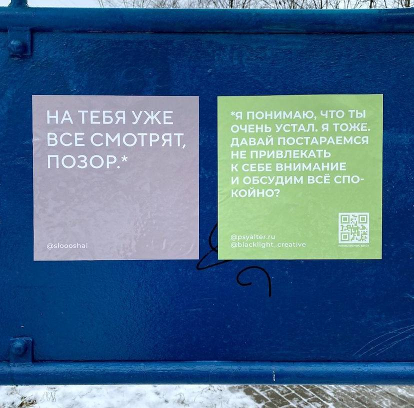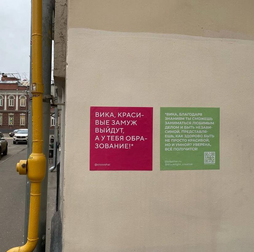Например, один из таких проектов — «Непослушные». Это проект-напоминание родителям о важности языка любви и поддержки в общении с ребенком. Пригласили к партнёрству сервис подбора психологов Alter и проект sloooshai — они помогли перевести токсичные фразы родителей на язык позитивных убеждений. А затем команда создала парные стикеры с обеими вариантами фраз и развесила на фасады зданий в Москве. Этот проект получил огласку в СМИ и соцсетях, а также — попал в шорт-лист Effie.
