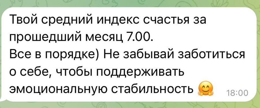 Бот работает уже год, и, в среднем, 70% сотрудников заполняют его три раза в неделю или чаще. Мы настроили аналитику по результатам так, чтобы можно было видеть изменения состояния команд оперативно. За этот год у меня получилось выявить по меньшей мере шесть кейсов и помочь ребятам справиться со стрессом, не переводя его в этап выгорания. Я тоже регулярно использую бот и заметила, что он помогает круто чекать состояние. Можно сказать, что для команды этот бот стал новой полезной привычкой — почти как ежедневные 10 тыс. шагов, но для ментального здоровья.
