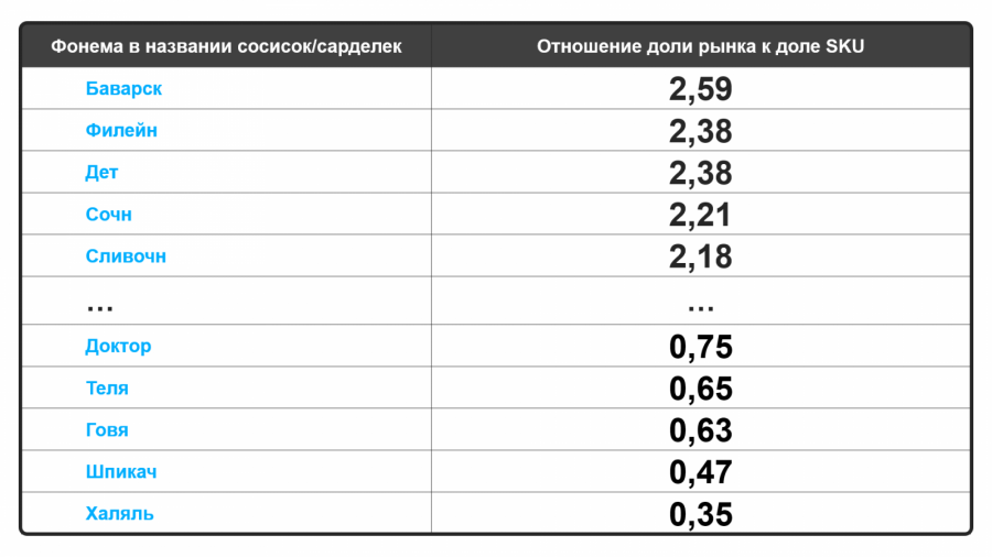 «Интересна ещё одна метрика — отношение доли рынка к доле SKU. Она косвенно показывает, насколько нейминг продукта цепляет потребителя. При этом, если продуктов с конкретным неймингом на витрине непропорционально много, то, возможно, производители берут количеством, а не качеством», — отмечает NTech. По этой метрике в тройку лидеров вместе с «Баварскими» сосисками входят «Филейные» и сосиски, ориентированные на детей. А вот продукты из говядины или телятины потребителя цепляют в наименьшей степени.