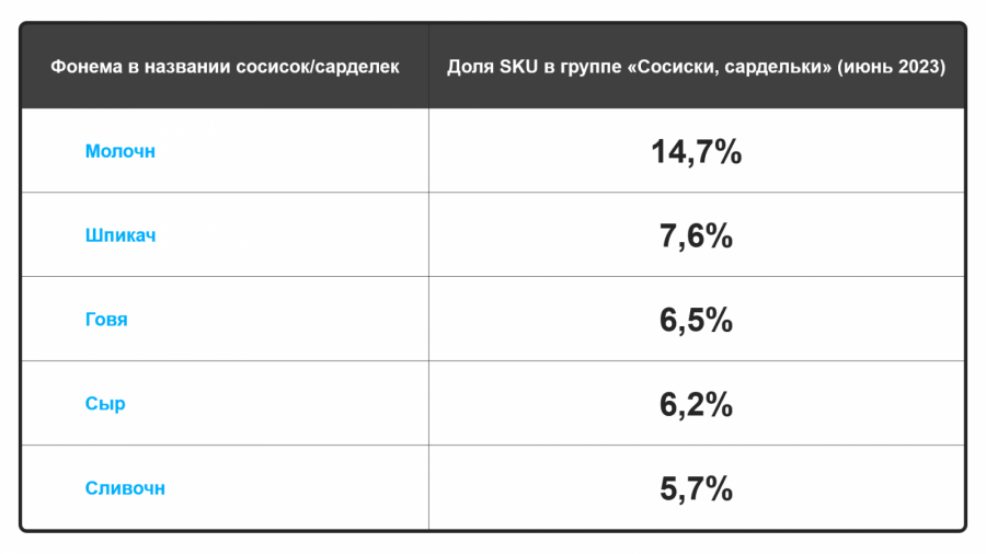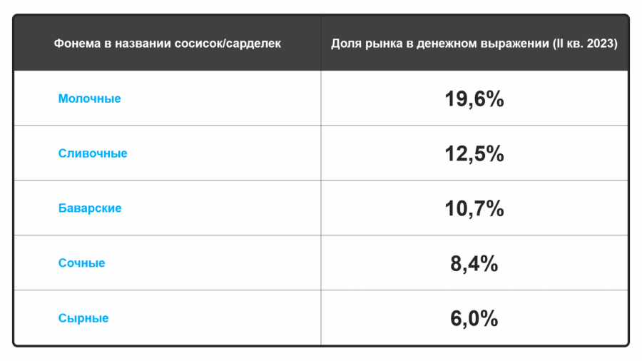 Сосиски, в названии которых упоминается слово «молочные», — это около 20% рынка сосисок и сарделек в денежном выражении. На втором месте, причём с достаточно большим отрывом от лидера, находятся «Сливочные» сосиски. Далее — «Баварские» и «Сочные». Замыкают топ-5 сосиски «С сыром», хотя и занимают всего лишь 6% рынка.