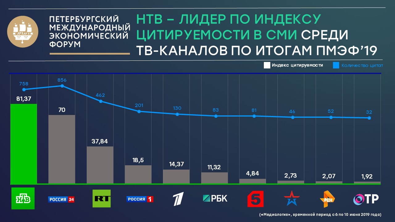 AO «Телекомпания НТВ» занял первое место по индексу цитируемости в СМИ среди российских телеканалов по итогам освещения Петербургского международного экономического форума. В этом году 1,7 млн пользователей посмотрели онлайн-трансляцию на специально запущенном НТВ круглосуточном интернет-канале, посвященном работе форума. Длительность трансляции составила 77 часов.