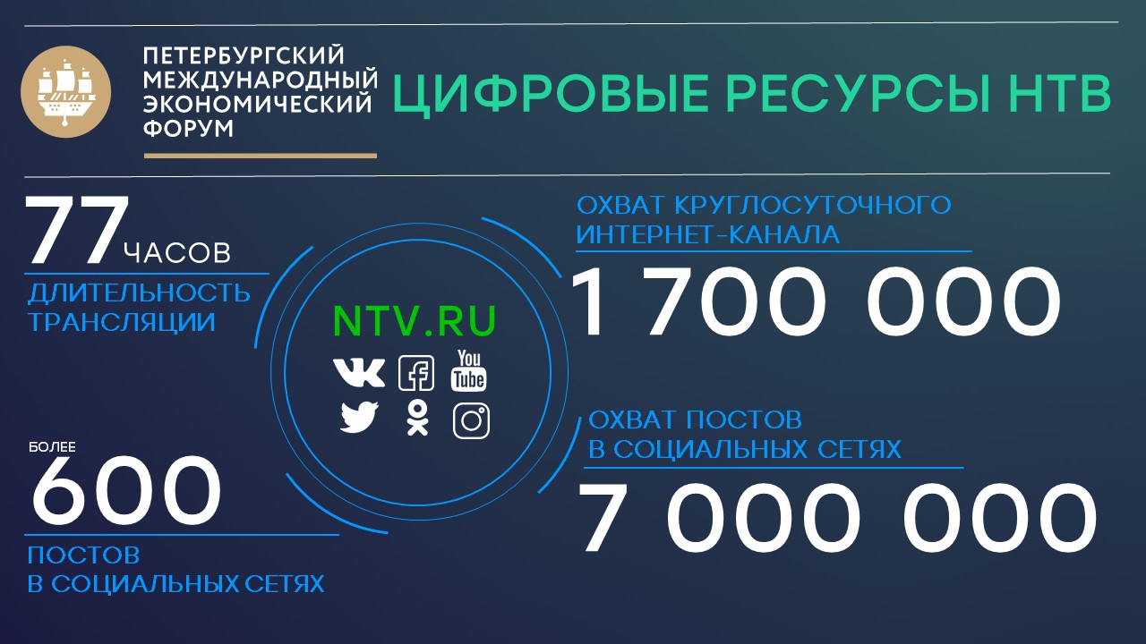 За время проведения и по его итогам ПМЭФ'19 НТВ на своих цифровых платформах опубликовал более 280 материалов, охват которых составил 375 тысяч пользователей. В официальных соцсетях телекомпании было создано более 600 постов, посвященных работе форума, общим охватом 7 млн.