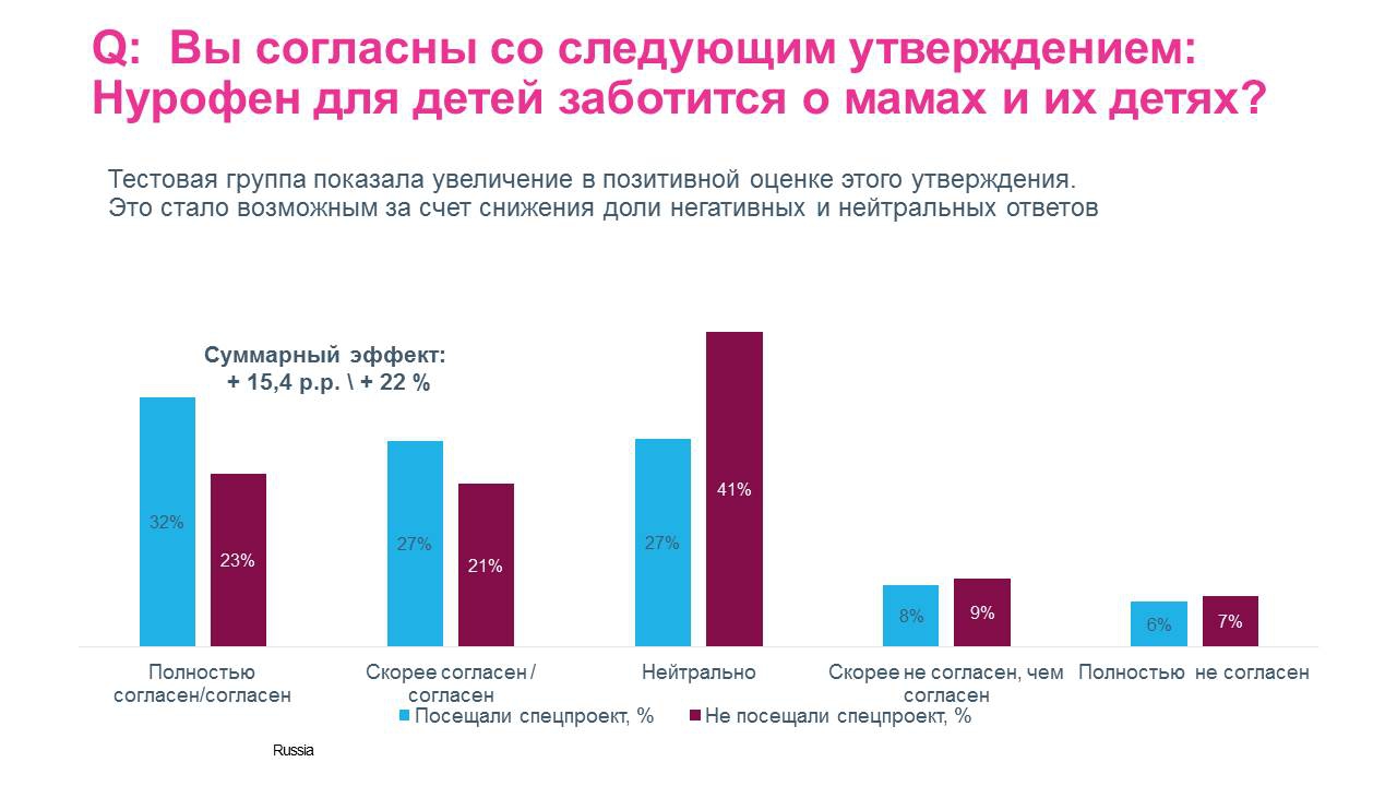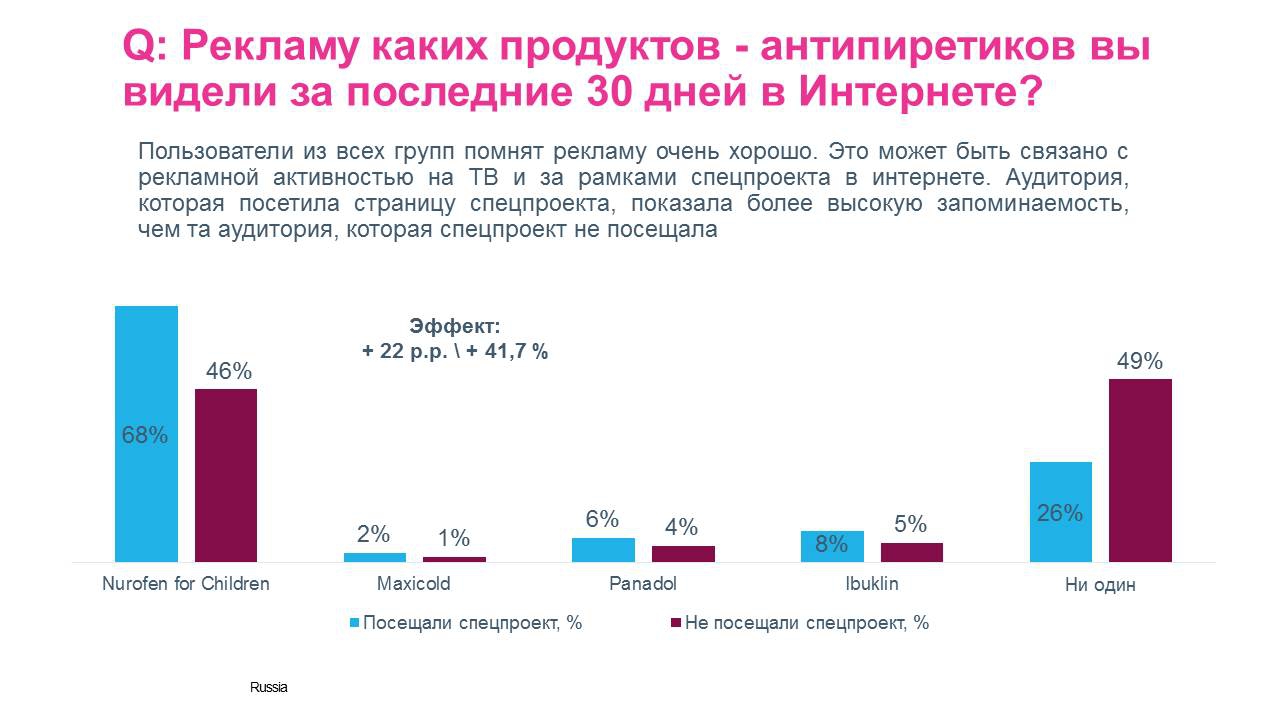 Прирост доверия Бренду составил 22% у тех, кто посетил проект «Сказки», а намерение к покупке «Нурофена» для детей в следующий раз, когда понадобятся детские антиперетики, выросло на 8,6%.