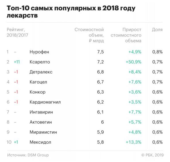 Самая популярная и продаваемая группа лекарств в России — это лекарства для пищеварительной системы. В общей сложности они держат 18,8% рынка (186,8 млрд руб.). Это намного выше, чем у ближайшей группы — препаратов для лечения сердечно-сосудистой системы (14,1% и 140 млрд руб.). При этом самым быстрорастущим по продажам в 2018 году стал препарат для лечения и предотвращение болезней сердечно-сосудистой системы «Ксарелто» немецкой компании Bayer. Он занял вторую строчку, хотя в прошлом занимал только 13-ю. Его продажи за год выросли на 50,9% и составили 7,2 млрд руб.