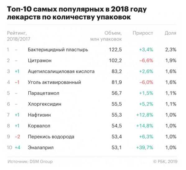 Самым популярным лекарственным средством по количеству проданных упаковок стал бактерицидный пластырь. На втором месте — цитрамон. Россияне купили 102,2 млн упаковок этого обезболивающего и жаропонижающего препарата. Составляющие цитрамона — парацетамол и ацетилсалициловая кислота также оказались в топе по количеству упаковок. Их было продано 56,7 млн и 83,2 млн пачек соответственно.