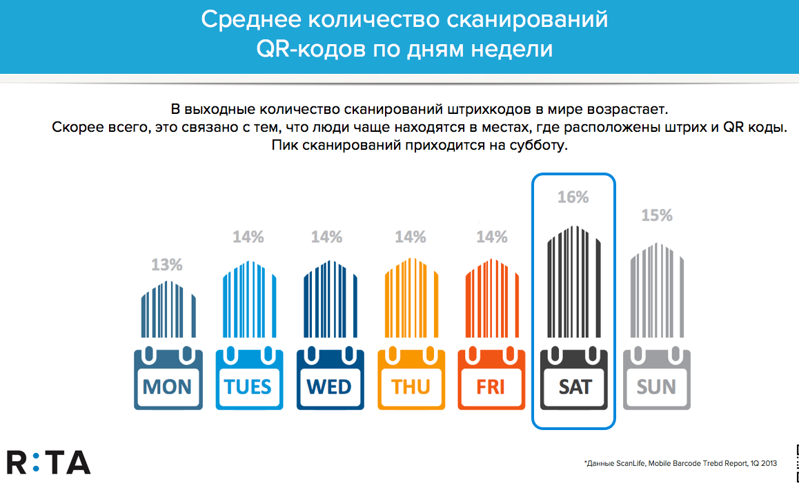 Мало кто знает, но количество сканирований QR-кодов возрастает в выходные, причем самый пик приходится на субботу. Это связано с тем, что именно в уикенд люди проводят время в местах, где расположены коды. Большая часть сканирований приходится на вторую половину дня, особенно в обеденное и послеобеденное время.