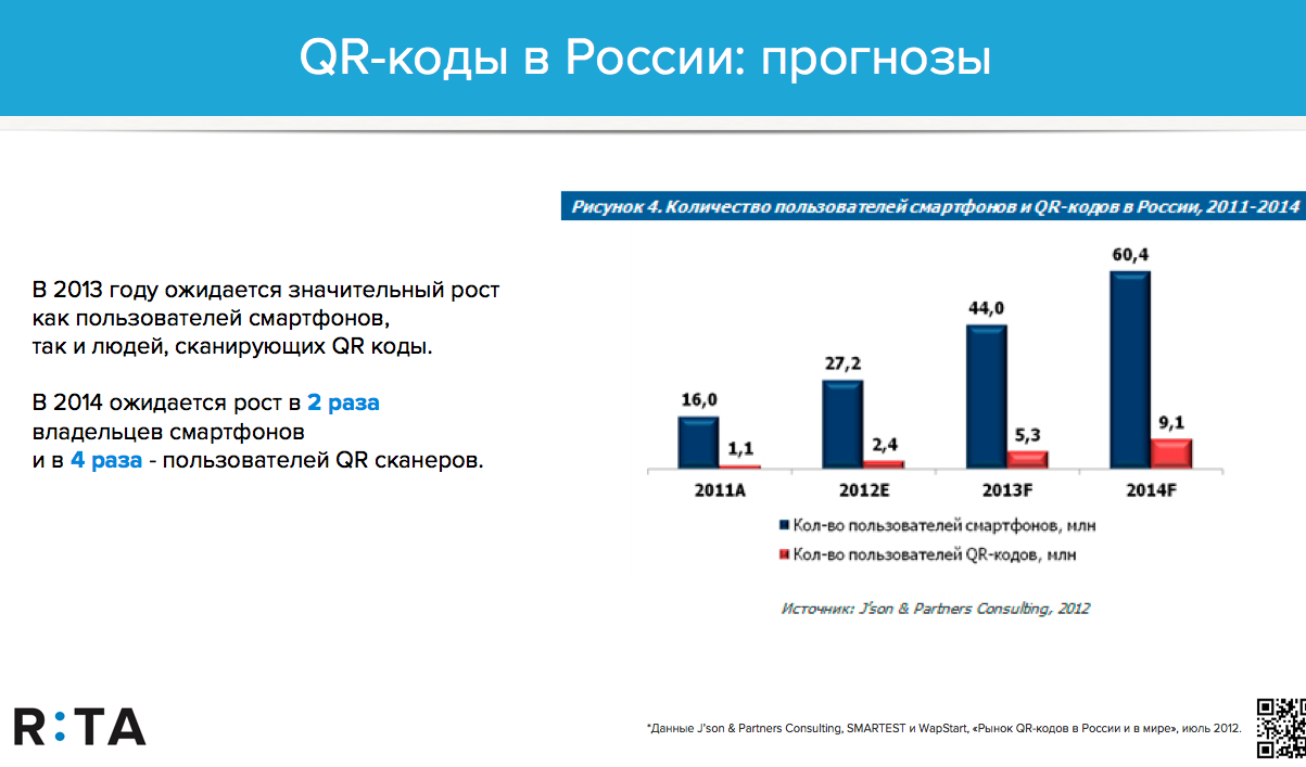 Тем не менее, в 2013 году в России ожидается значительный рост пользователей смартфонов и тех, кто пользуется QR-кодами. В 2014 году количество владельцев смартфонов должно увеличиться в 2 раза, а пользователей QR-сканеров – в четыре.