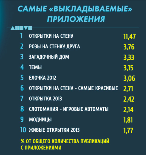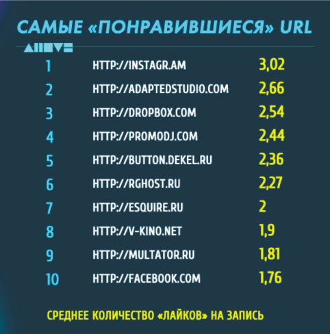 Результаты исследования представлены ниже с помощью инфографических таблиц. Среди освещаемых вопросов: "Самые выкладываемые url", "Самые "понравившиеся" url", а также "Самые "выкладываемые" приложения".