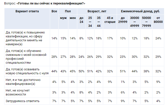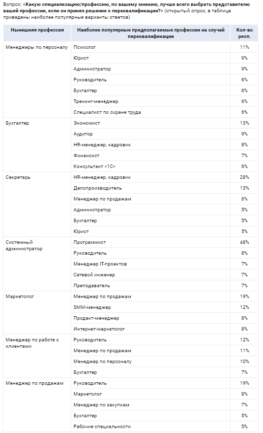 Современный вариант переквалификации — стать экспертом по программному обеспечению, с которым работаешь: так, часть бухгалтеров рассчитывает в случае переквалификации стать консультантами «1С», проектировщики и системные администраторы — разработчиками. По сравнению с аналогичным исследованием 2015 года, россияне стали реже выбирать для переквалификации профессии в сфере продаж, сосредоточившись на смежных сферах деятельности.