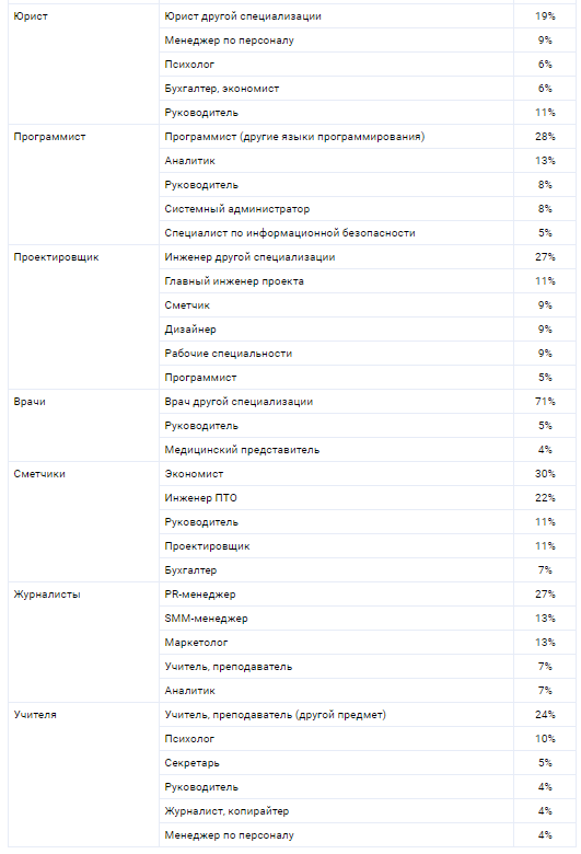 Опрос представителей 14 наиболее популярных профессиональных групп показал, что в вопросе переквалификации респонденты чаще всего размышляют о смежных сферах деятельности. Так, бухгалтеры и сметчики рассчитывают освоить профессию экономиста, маркетологи — продажи. Юристы готовы освоить другие отрасли права, учителя — другие предметы, программисты — другие языки программирования, аналитику или информационную безопасность, врачи и инженеры — другие специализации, журналисты рассчитывают перейти в сферу PR.