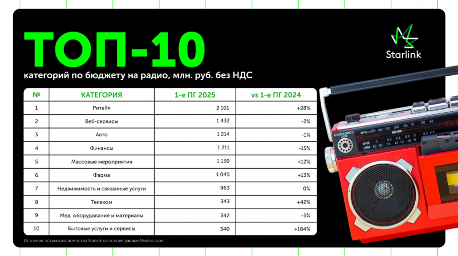 По оценке Starlink, в первом полугодии 2025 года объем радиорекламы в России составил около 12 млрд руб., что на 15% больше, чем в первом полугодии 2024 года. Положительная оценка основана на росте уровня медиаинфляции и более сдержанной оценки динамики роста в 2024 году. Просадки в количестве задействованного инвентаря в сравнении с аналогичным периодом прошлого года не наблюдается.