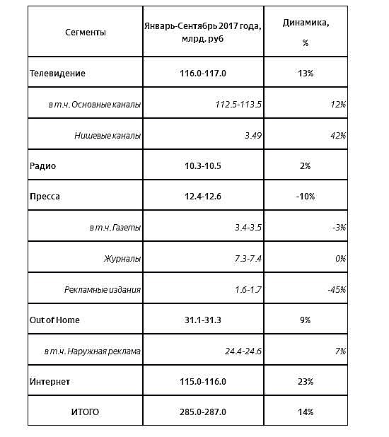 Результаты по итогам 3 кварталов 2017 года во многом объясняются укрепившимся доверием рекламодателей к эффективности коммуникаций в изменяющейся экономической среде, а также растущим предложением новых рекламных возможностей на ТВ и в интернете. Они вполне могут стать локомотивом для восстановления позиций и дальнейшего роста в других сегментах рынка, а также поддержать региональные медиа».