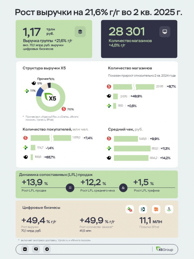 Во втором квартале чистая выручка X5 выросла на 21,6% год к году, до 1,17 трлн руб. благодаря росту LFL-продаж на 13,9% и увеличению торговых площадей.