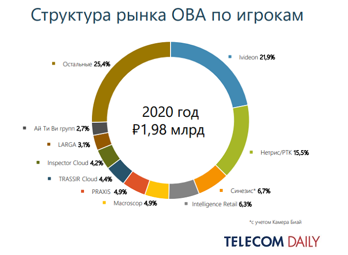 Рынок ОВА, по сравнению с ВА, уже консолидирован и распределен между игроками, отмечает TelecomDaily. Лидерами на рынке облачной видеоаналитики РФ по результатам 2020 года года стали операторы двух крупнейших облачных платформ — Ivideon (21,9%) и «Ростелеком» (15,5%).