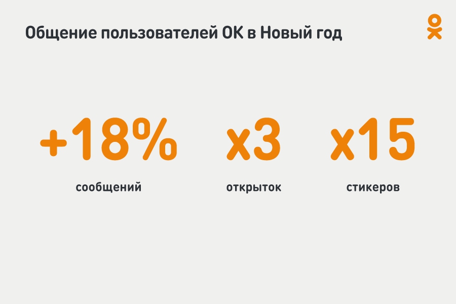 Пользователи активно выражали эмоции в Новый год с помощью открыток и стикеров в сообщениях. Так, 31 декабря пользователи получали открытки в два раза чаще, чем год назад, а за все новогодние каникулы в ОК было отправлено более 50 миллионов открыток — в три раза больше, чем в прошлом году. Количество отправленных стикеров по сравнению с предыдущим Новым годом также выросло в 15 раз.