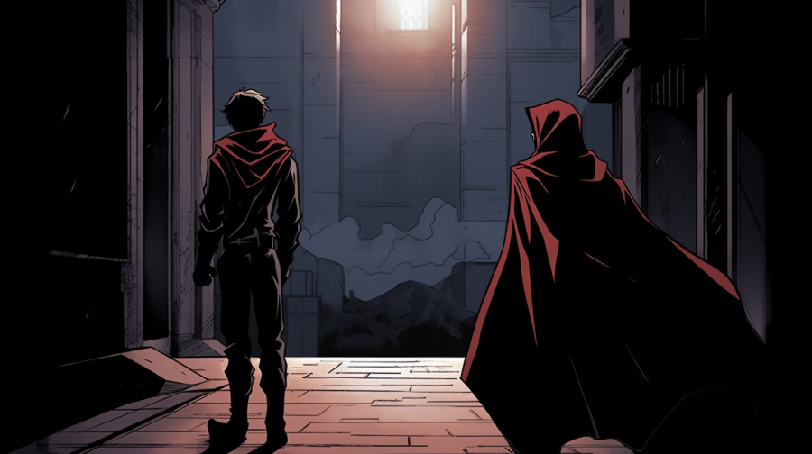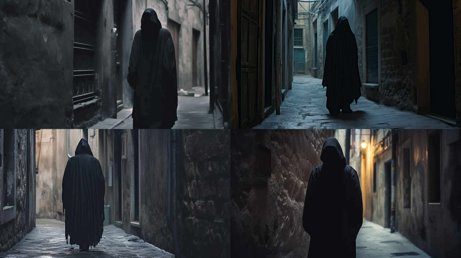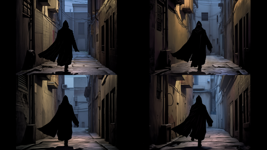 A medium-shot photograph capturing a narrow, desolate alley as the backdrop. A mysterious figure in a black cloak with a hood, evoking the image of a benevolent Nazgul, is seen leaning back against a wall, facing away from the camera. The face is hidden, and the silhouette of the hood and cloak is beautifully defined. Medium: Digital Photography. Style: Manga-inspired dynamic graphic comics without dialogue clouds. Lighting: Low-key, with a soft ambient glow highlighting the intricate folds and silhouette of the cloak and hood. Colors: Dark, moody tones with a focus on the blackness of the cloak. Composition: Shot with a Canon EOS 5D Mark IV DSLR camera, EF 85 mm f/1.8 USM lens, Resolution 30.4 megapixels, ISO sensitivity: 1600, Shutter speed 1/60 second, employing a shallow depth-of-field to focus solely on the figure's silhouette and the narrow alley. --ar 16:9 --v 5.1 --style raw --s 750