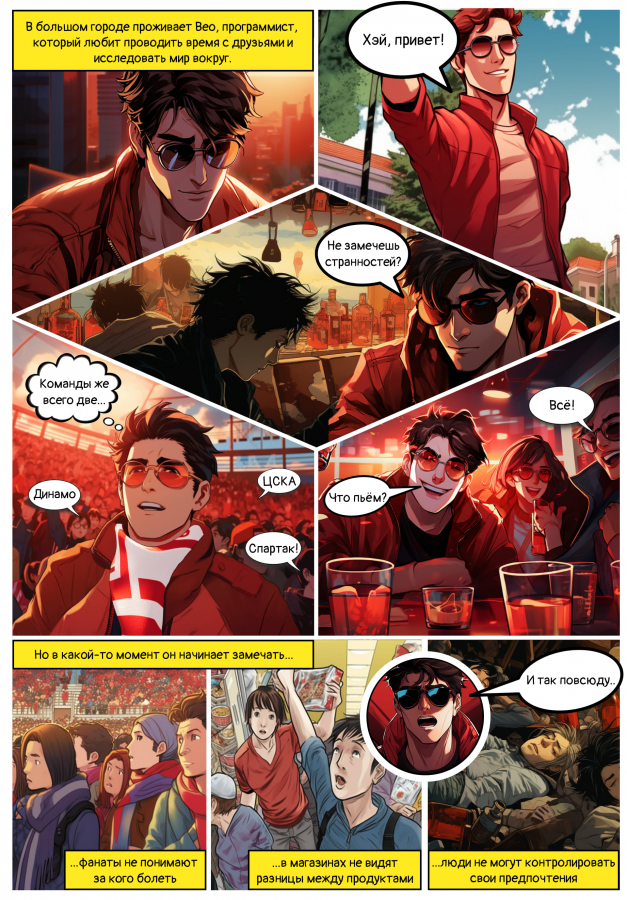 Проблемой здесь стало то, что AI каждый раз генерирует персонажа заново, и почти всегда они абсолютно не похожи друг на друга.