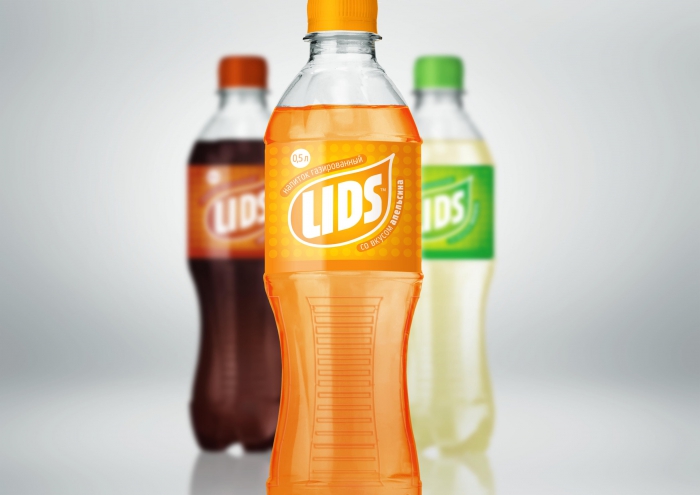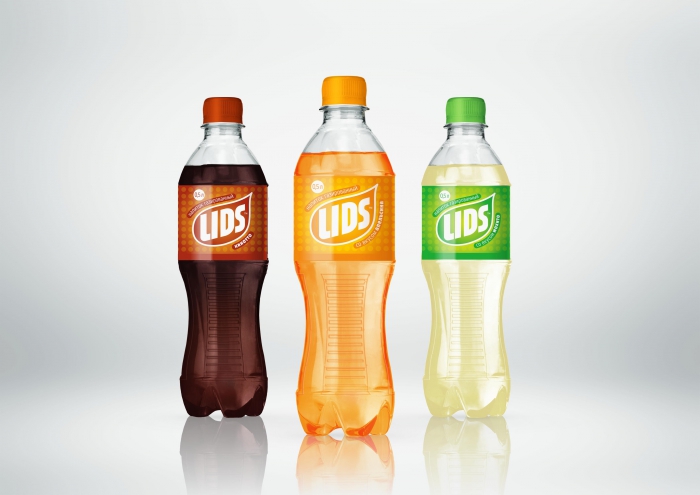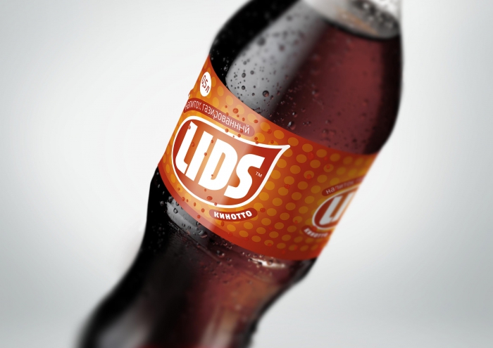 Решение общего стиля этикетки «LIDS» выполнено простыми графическими средствами. Локальные цветные заливки отбивают вкусы в линейке, крупный растр напоминает пузырьки шипучего напитка, краткое динамичное шрифтовое название подчеркивает характер продукта.