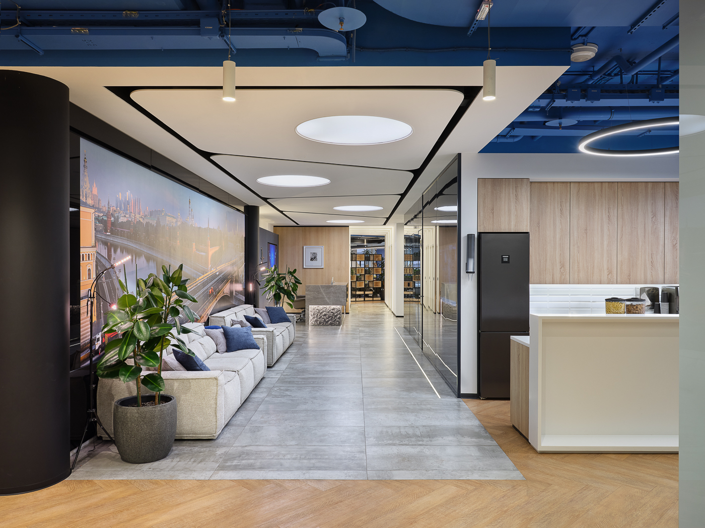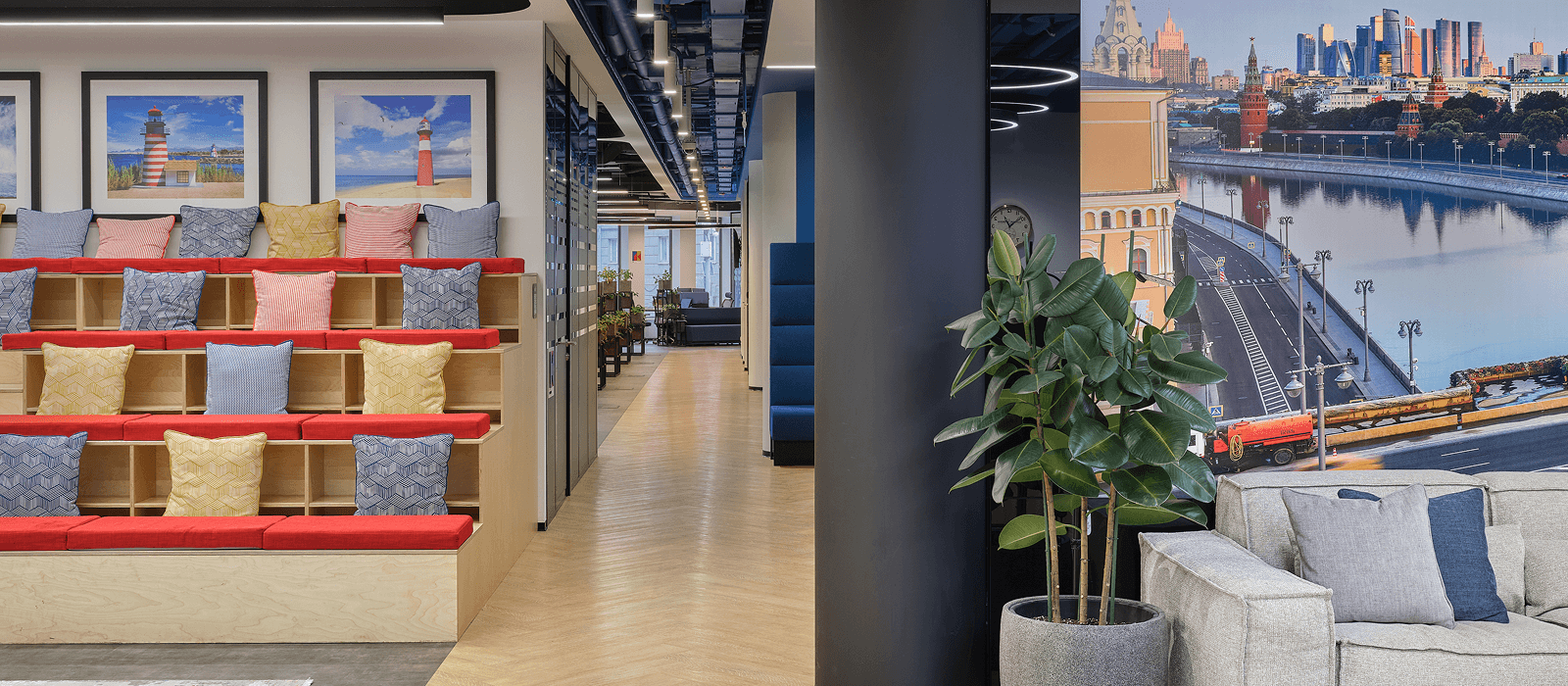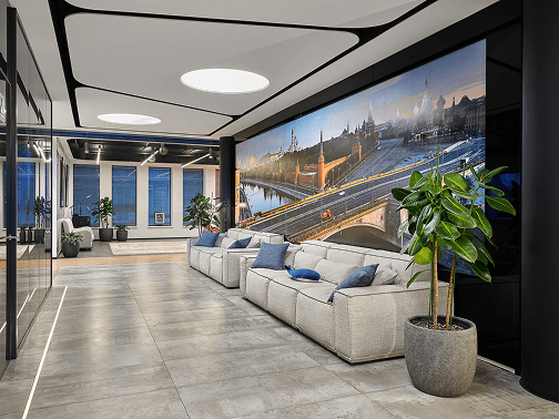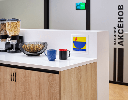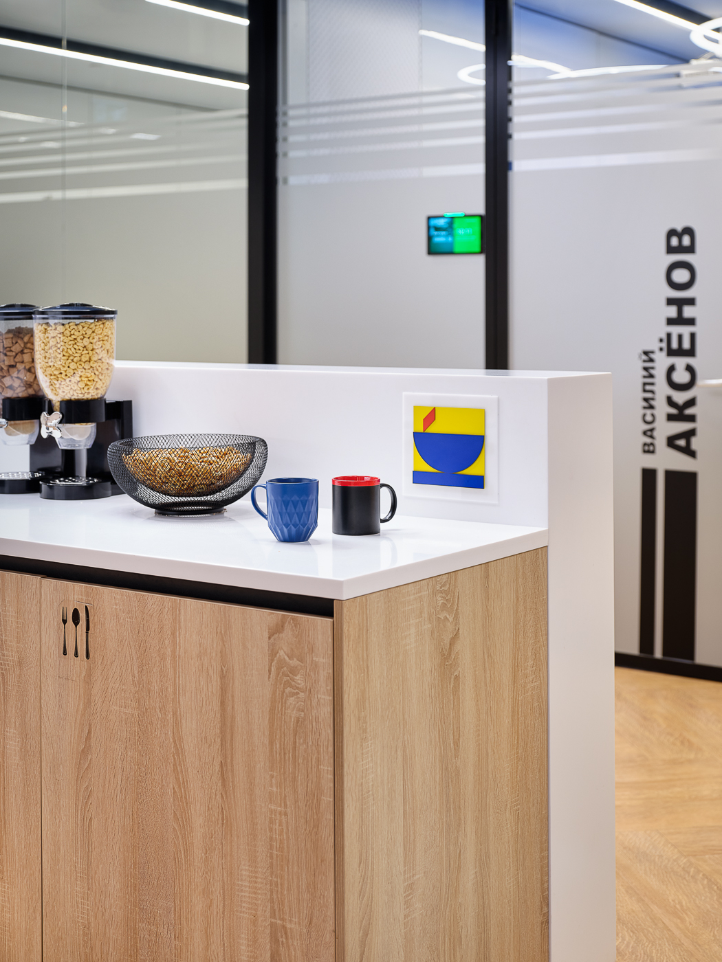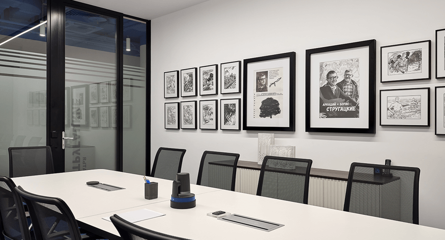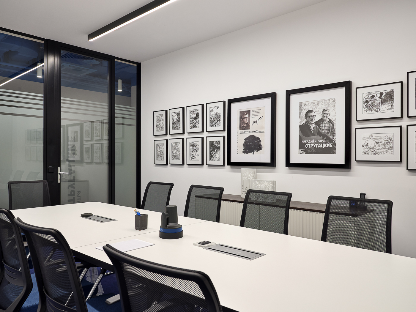 Финансисты, бухгалтерия, юристы и HR-команда занимают закрытые от мира опен-спейса пространства. Коллегам нужна тишина и приватность. Это важно, когда работаешь с цифрами и с любого вида конфиденциальной информацией. Также в офисе много удобных и уютных переговорок для встреч и совещаний. Переговорные названы именами писателей: Константин Симонов, братья Стругацкие, Юлиан Семенов, Василий Аксенов, Артур Хейли, Эрих Мария Ремарк, Клиффорд Саймак. Их интерьер рассказывает о произведениях авторов постерами и картинами, выполненными и оформленными индивидуально.