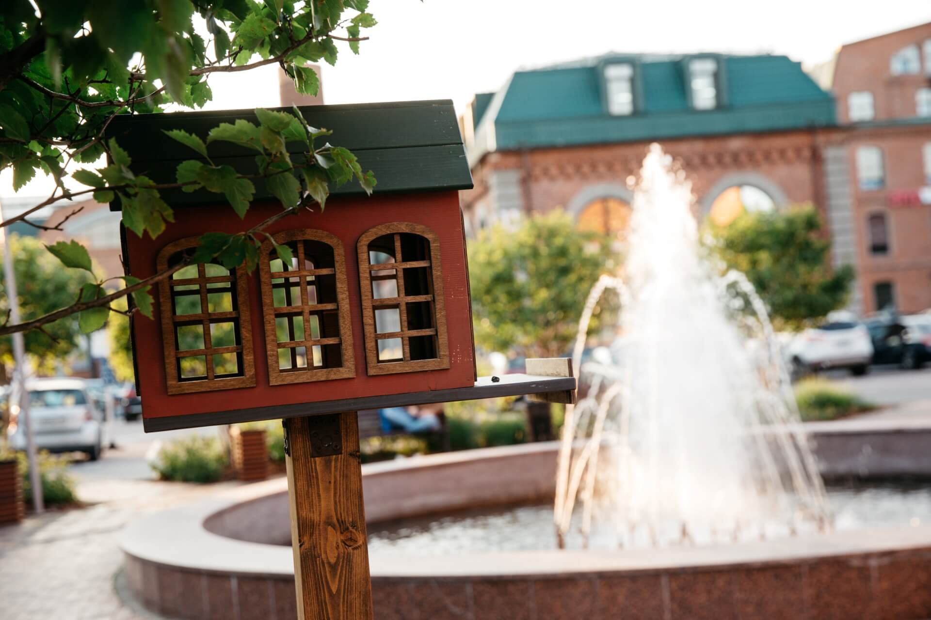 В фонтане плавают надувные фламинго, башня боем часов сообщает о течении рабочего времени, лавочки с концептуальными подписями заполняются людьми по предпочтениям: кто почитать книгу, кто обсудить фильм, а кто просто помечтать или погенерировать сумасшедшие идеи – словом, в рабочее время, в минуте от офиса переключить сознание и абстрагироваться от рутины.
