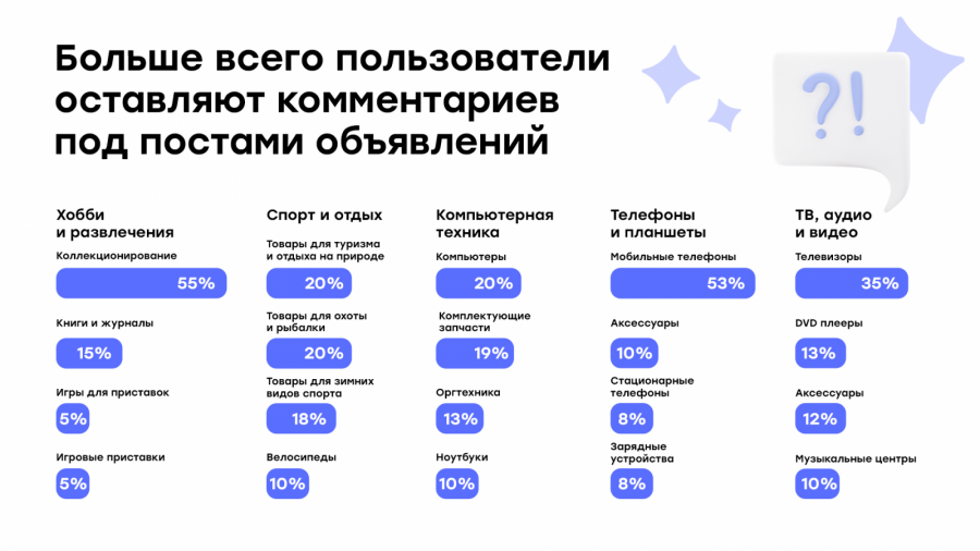 В топ-5 самых обсуждаемых категорий объявлений вошли «хобби и развлечения», «спорт и отдых», «компьютерная техника», «телефоны и планшеты», «ТВ, аудио и видео». Объявления в этих категориях набирают в среднем от 26 комментариев под одним постом — это на 33% больше, чем в других категориях.