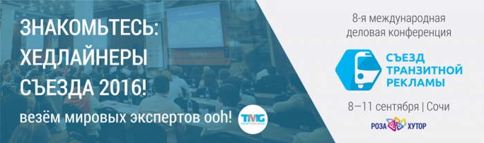 Федеральный оператор рекламы на транспорте Transit Media Group объявил хедлайнеров 8ого Съезда Транзитной Рекламы, который пройдет 8-11 сентября в Сочи (Роза Хутор).