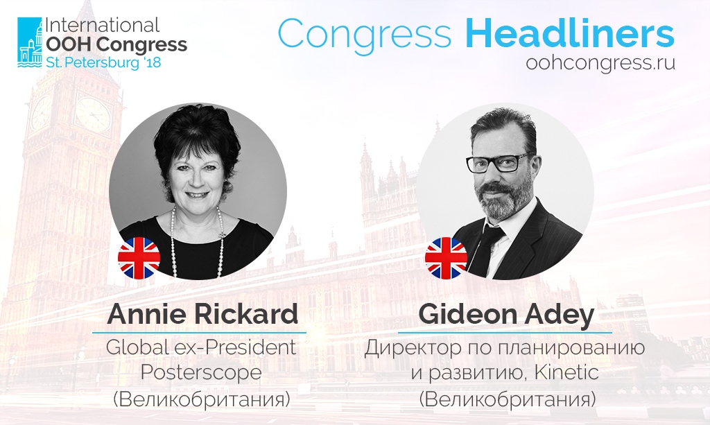 В этом году первыми подтвержденными хедлайнерами OOH Конгресса 27−29 сентября в Петербурге стали: легендарная Анни Рикард (Annie Rickard), ex-global President, Posterscope, Великобритания и Гидеон Адей (Gideon Adey), директор по планированию и развитию Kinetic, Великобритания, который выступит перед российской аудиторией впервые.