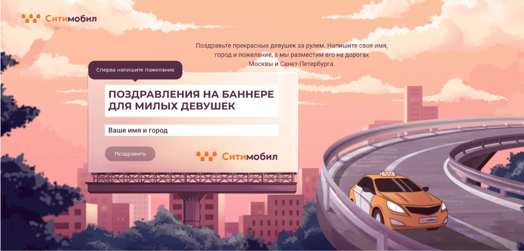 Сервис заказа такси «Ситимобил» объявил сбор поздравлений от своих пользователей к 8 Марта. Самые искренние и теплые слова для женщин к наступающему празднику окажутся на билбордах Москвы и Санкт-Петербурга.