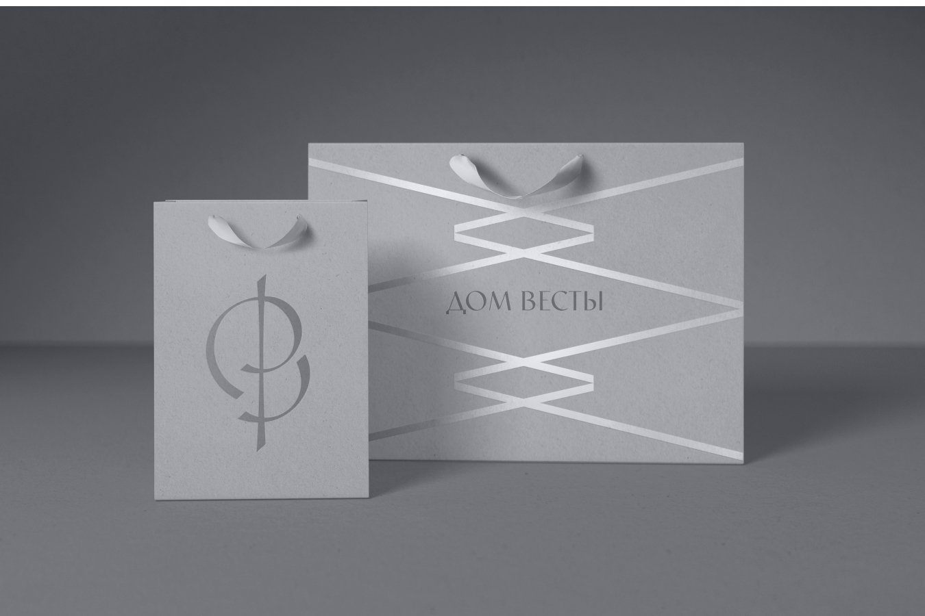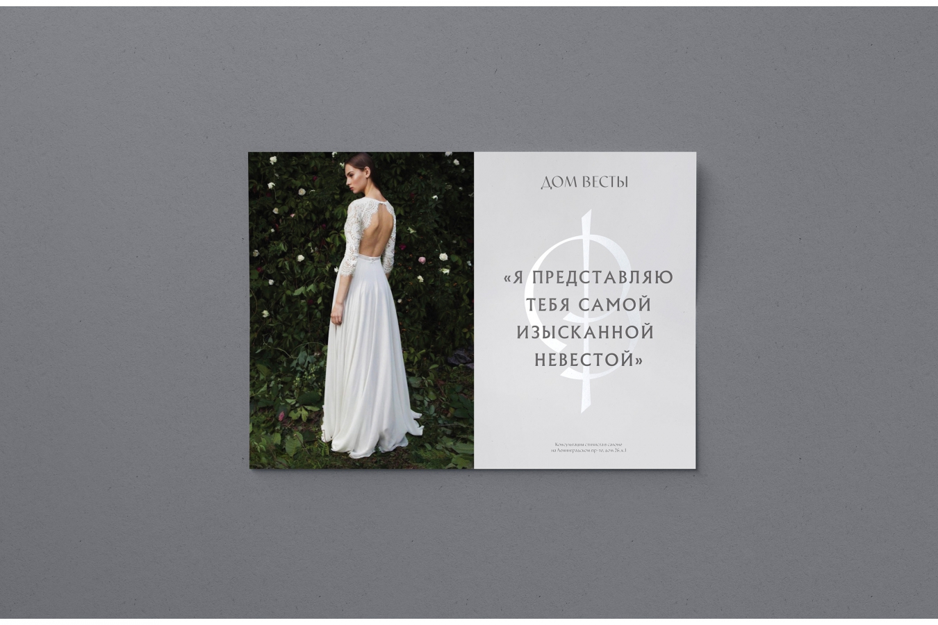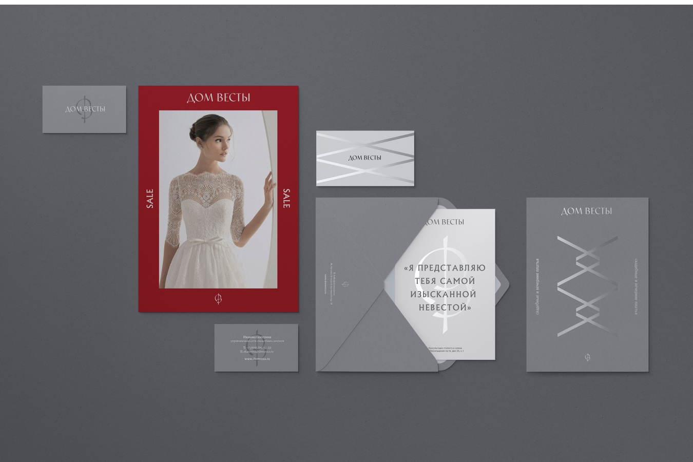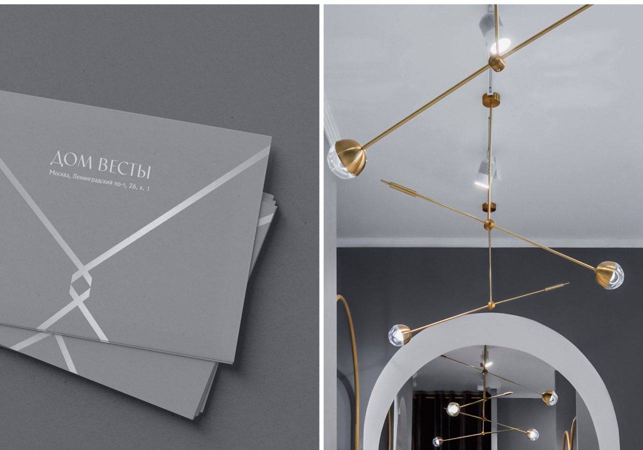 В основе лаконичного и утонченного фирменного стиля «Дома Весты» лежит метафора примерки свадебного платья. Процедура шнуровки корсета — процесс интимный, напоминающий внутреннюю медитацию. Образ лент лег как в основу всего фирменного стиля, так и знака-монограммы ДВ.
