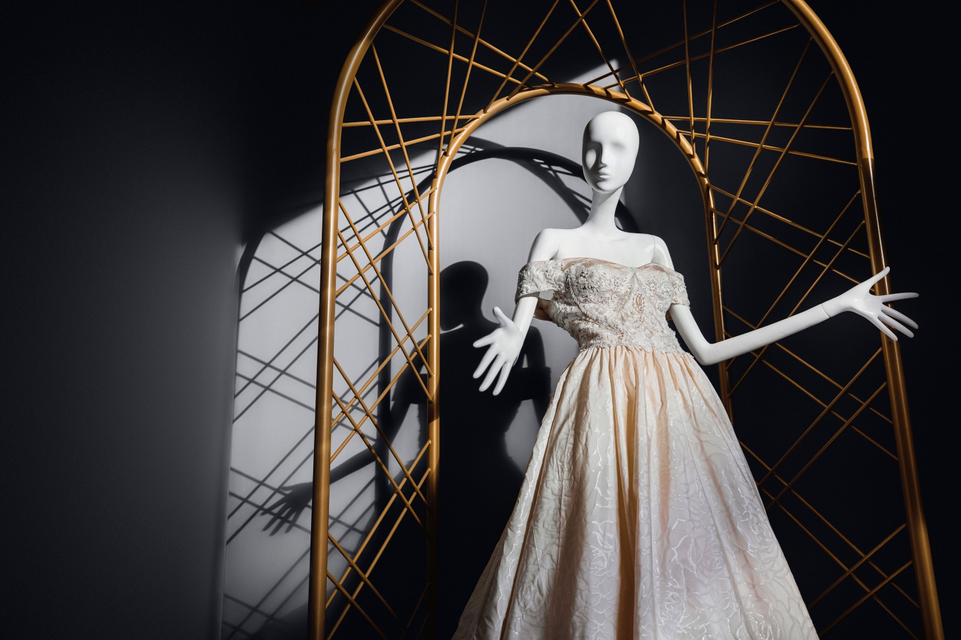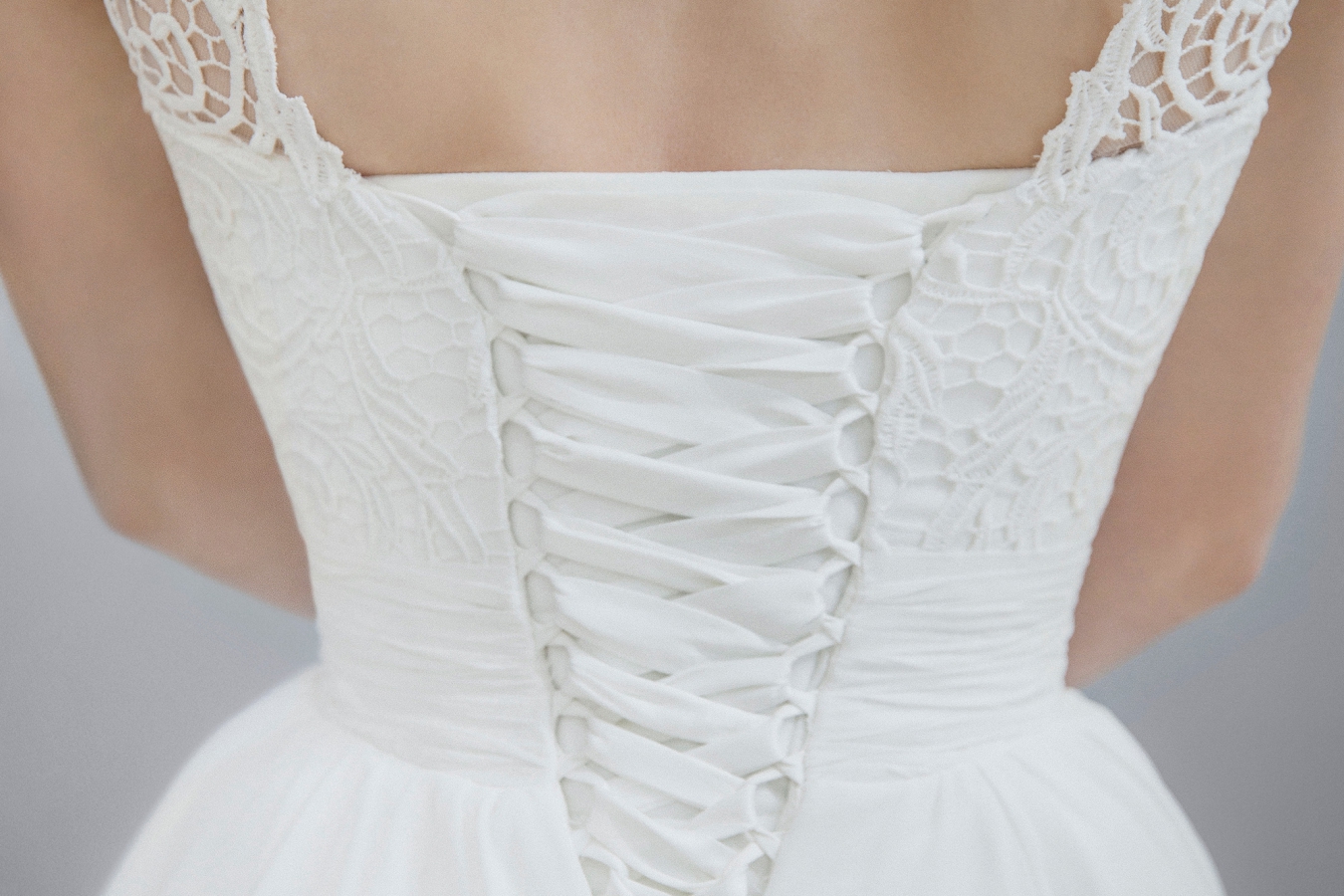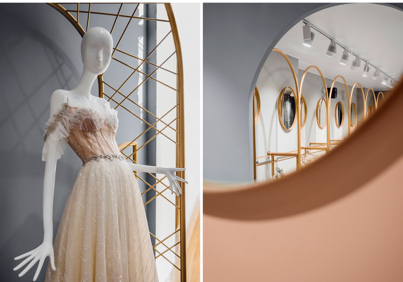 Тема лент, шнуровки и арок переосмыслена и перенесена и в интерьер салона. Арки прослеживается в торговом оборудовании — в облегченных арочных элементах хранятся наряды. От перекрещивающихся люстр в зале и в витринах возникает ассоциация корсетной шнуровки. При отделке интерьера использованы такие материалы как: мрамор, позолота, фактурные ткани вроде бархата, гипсовые профили. Золото в интерьере добавлено дозированно, в сочетании с серебром, что создает атмосферу тепла и уюта. Зонирование пространства магазина решено таким образом, что покупательницы не пересекаются друг с другом. Зеркала добавляют эффект глубины и многослойности.