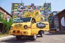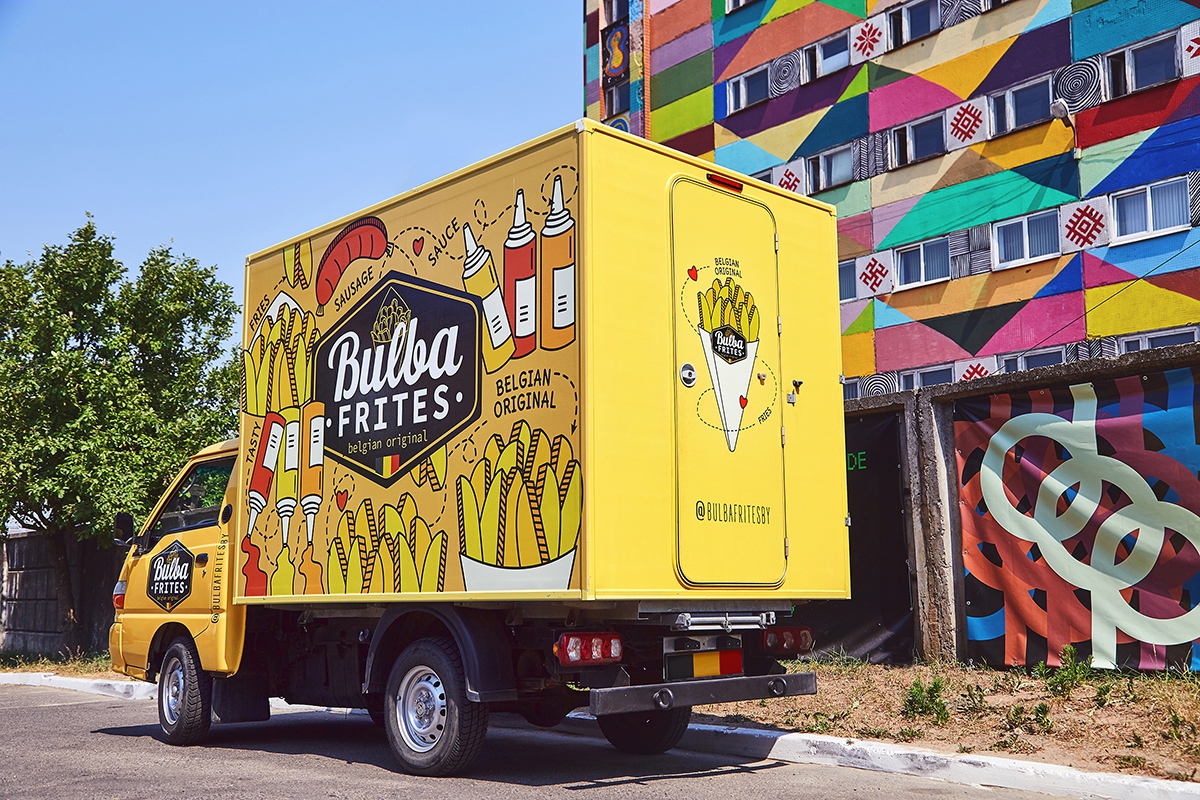 В основе разработанного дизайн-решения — акцентный логотип, делающий фудтрак и модуль заметными издалека. Для брендирования внешней части использованы лаконичные фуд-иллюстрации в стилистике быстрого скетча, рассказывающие о продукте. В качестве фирменных выбраны цвета бельгийского флага, что рассказывает о родине рецепта картофеля.